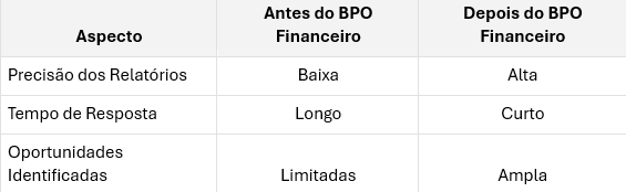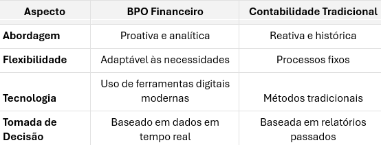 A tabela abaixo resume as principais diferenças entre os processos de BPO Financeiro e Contabilidade Tradicional:
